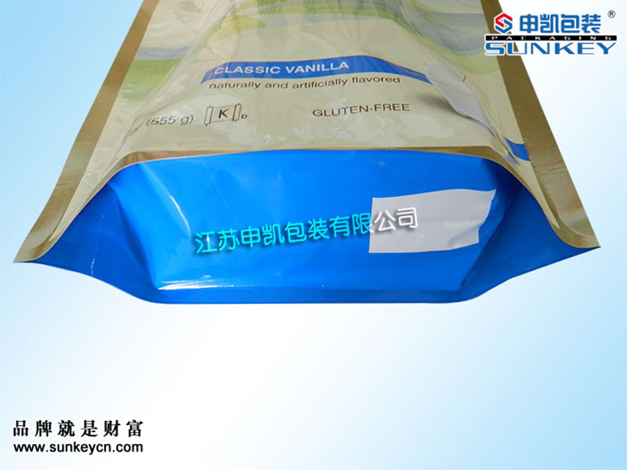 說明:奶粉站立拉鏈袋材質(zhì)一般是由PET/AL/PE組成,經(jīng)過印刷-檢品-復(fù)合-制袋等多層工藝。